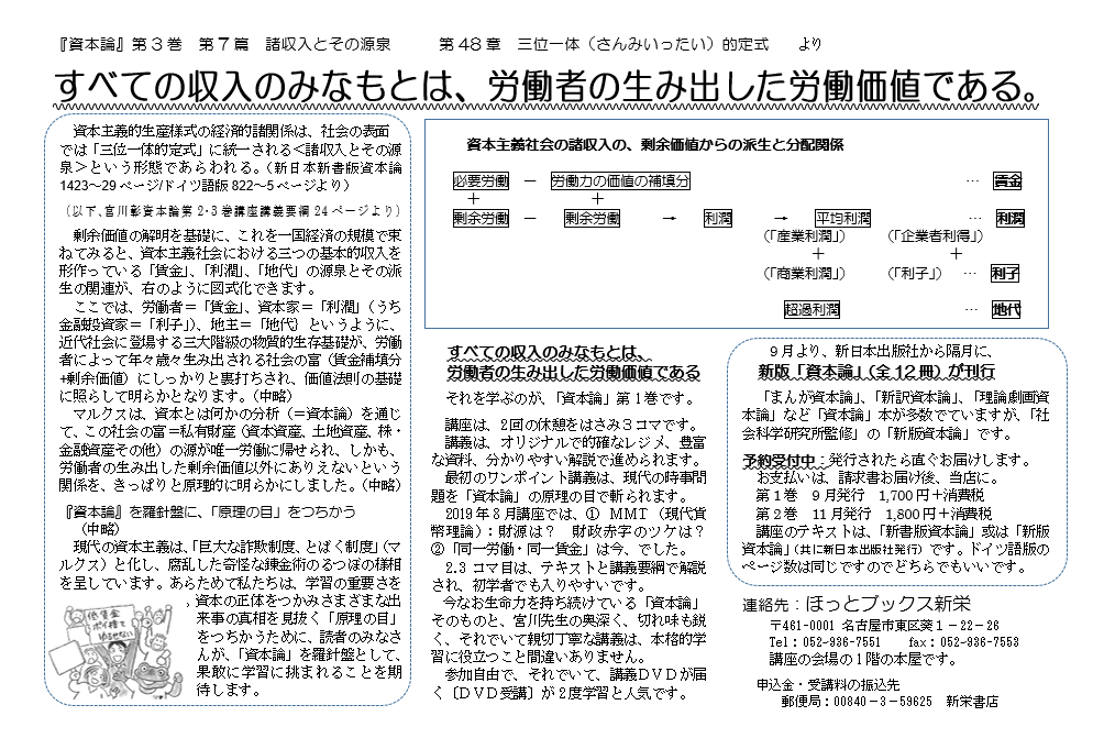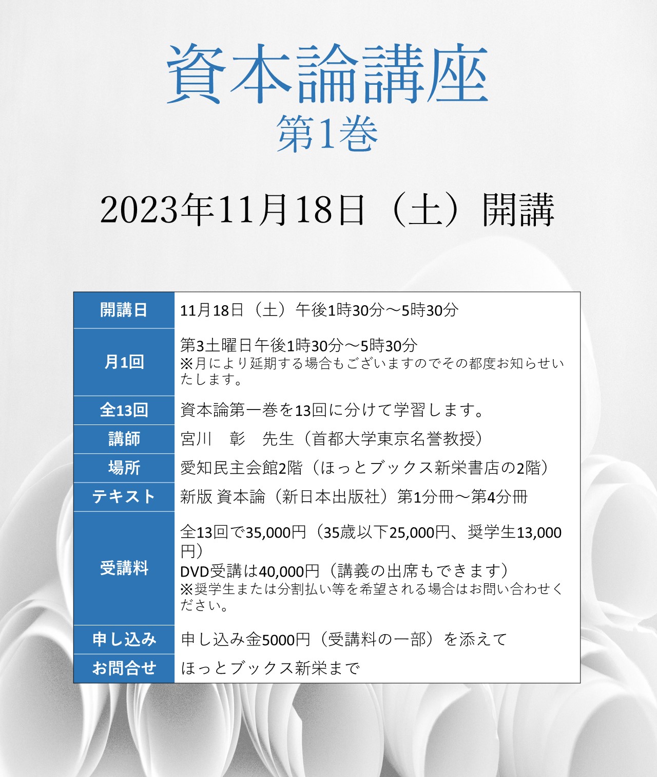 | 弟3土曜日 13時30分~17時30分 【講師】 宮川彰(1948年愛知県木曽川生まれ、首都大学東京名誉教授) 【テキスト】 新日本新書版「資本論」弟5分冊から弟7分冊 【会場】 愛知民主会館2階会議室(ほっとブックス新栄の2階です 【受講料】 全10回 27,000円 35歳以下 10,000円 【DVD受講】 30,000円 (レジメ資料、毎回の講義DVD、講義冊子付き。講義参加自由) |